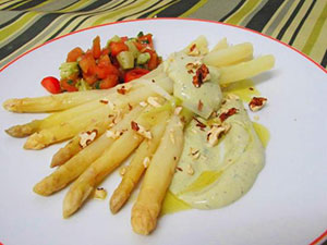 5. Sirve los espárragos, baña con la salsa y pon a un lado la ensalada como guarnición. Puedes decorar con un poco de nueces picadas y un chorrito de aceite de oliva. Los espárragos con aguacate es un plato delicioso y si te gusta el aguacate también puedes probar los aguacates rellenos vegetarianos.