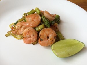 5. Servir el salteado de espárragos y gambas, ¡a disfrutar!.