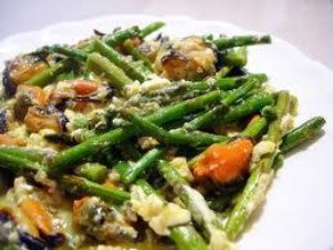 9. Ponemos una sartén con un poquito de aceite y echamos los huevos con los espárragos.