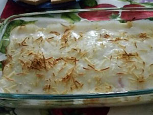 4. Vertemos la salsa bechamel por encime y terminamos espolvoreando el queso para gratinar. La cantidad de salsa y de queso son al gusto.