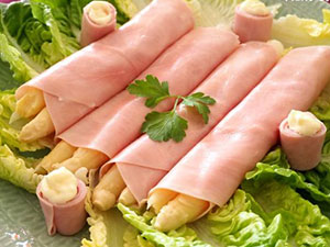 2. A continuación, cogemos dos o tres espárragos del bote, según el grosor, y tras escurrirlos bien los colocamos sobre la loncha y la enrollamos con cuidado. Y así repetimos la misma operación hasta que nos queden todos los espárragos envueltos en jamón York.